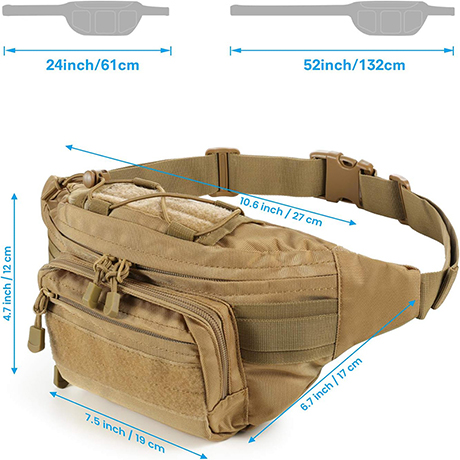 Tactical waist pack is crafted from 900D high-density oxford fabric, offering resistance to scratches and water splashes. It features a robust ABS buckle and measures approximately 10 1/4" x 6 11/16" x 7 1/2". The adjustable waist strap accommodates waists from 26" to 59" with a quick-release mechanism, and includes two elastic bands on the sides for securing excess strap length. This military-style waist bag boasts multiple compartments, including a main compartment with a double zipper, an interior open pocket, two front zipper pockets, and a discreet anti-theft pocket on the back for securing phones, wallets, and other valuables.